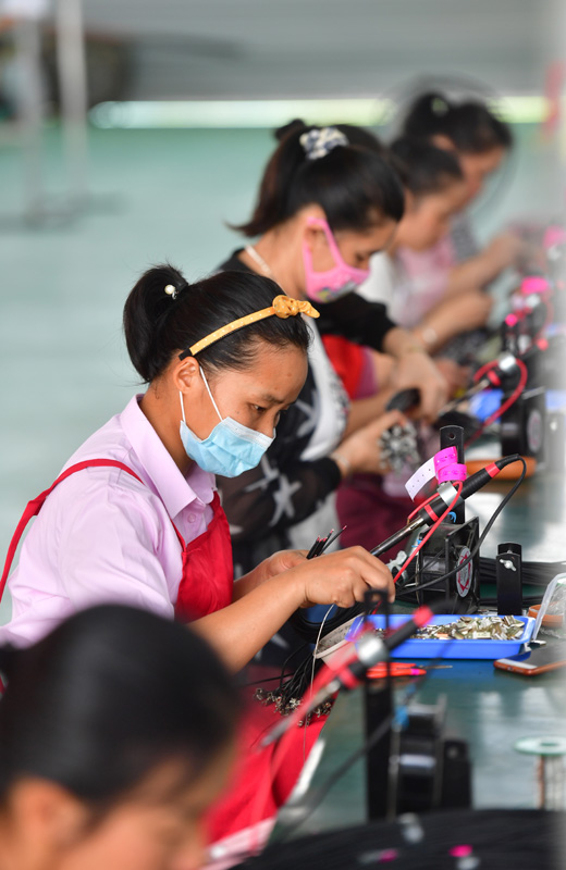 5月17日,在廣西融安縣農產(chǎn)品加工暨粵桂扶貧協(xié)作產(chǎn)業(yè)園,一家電子產(chǎn)品企業(yè)的工人在扶貧車(chē)間生產(chǎn)線(xiàn)上作業(yè)。新華社記者 黃孝邦 攝