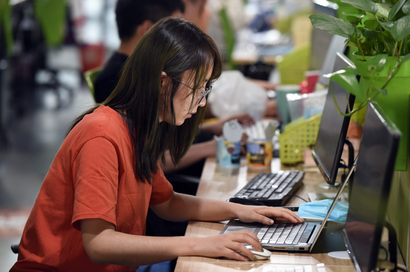 5月12日,今年校招入職的管培生方穎在位于安徽蕪湖市的三只松鼠股份有限公司工作。自2月9日復工以來(lái),三只松鼠股份有限公司基于業(yè)務(wù)持續發(fā)展需求,采用直播宣講、視頻面試等線(xiàn)上方式進(jìn)行招聘,通過(guò)純在線(xiàn)面試錄用的應聘者占比超過(guò)70%。部分獲聘應屆畢業(yè)生已經(jīng)入職工作。新華社發(fā) 周牧 攝