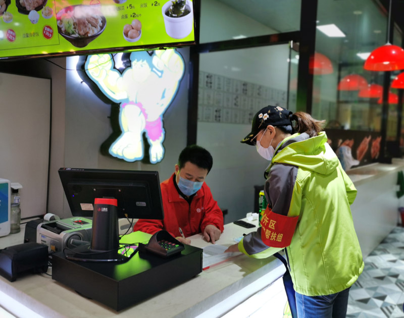 4月9日,天津市金融局下沉干部(右)在市內一家商場(chǎng)了解中小微企業(yè)復工情況,并送去防疫物資。新華社記者 劉惟真 攝