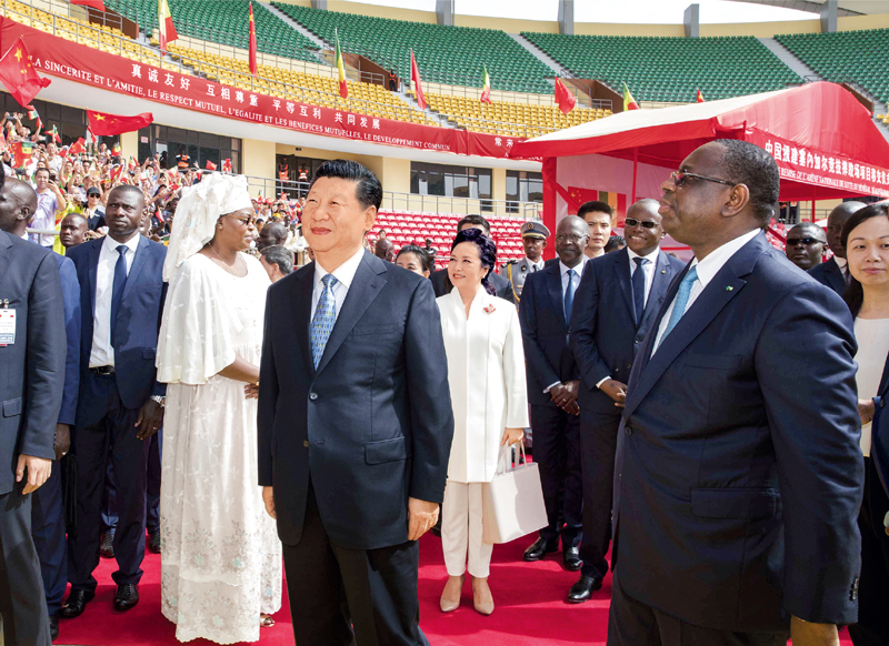 2018年7月22日,國家主席習近平在達喀爾同塞內加爾總統薩勒共同出席塞內加爾競技摔跤場(chǎng)項目移交儀式。 新華社記者 王曄/攝